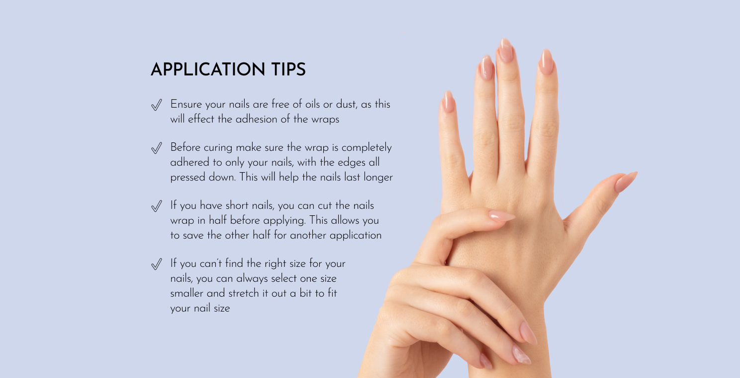 The wrap can be applied like a sticker. Press down onto the nail firmly.